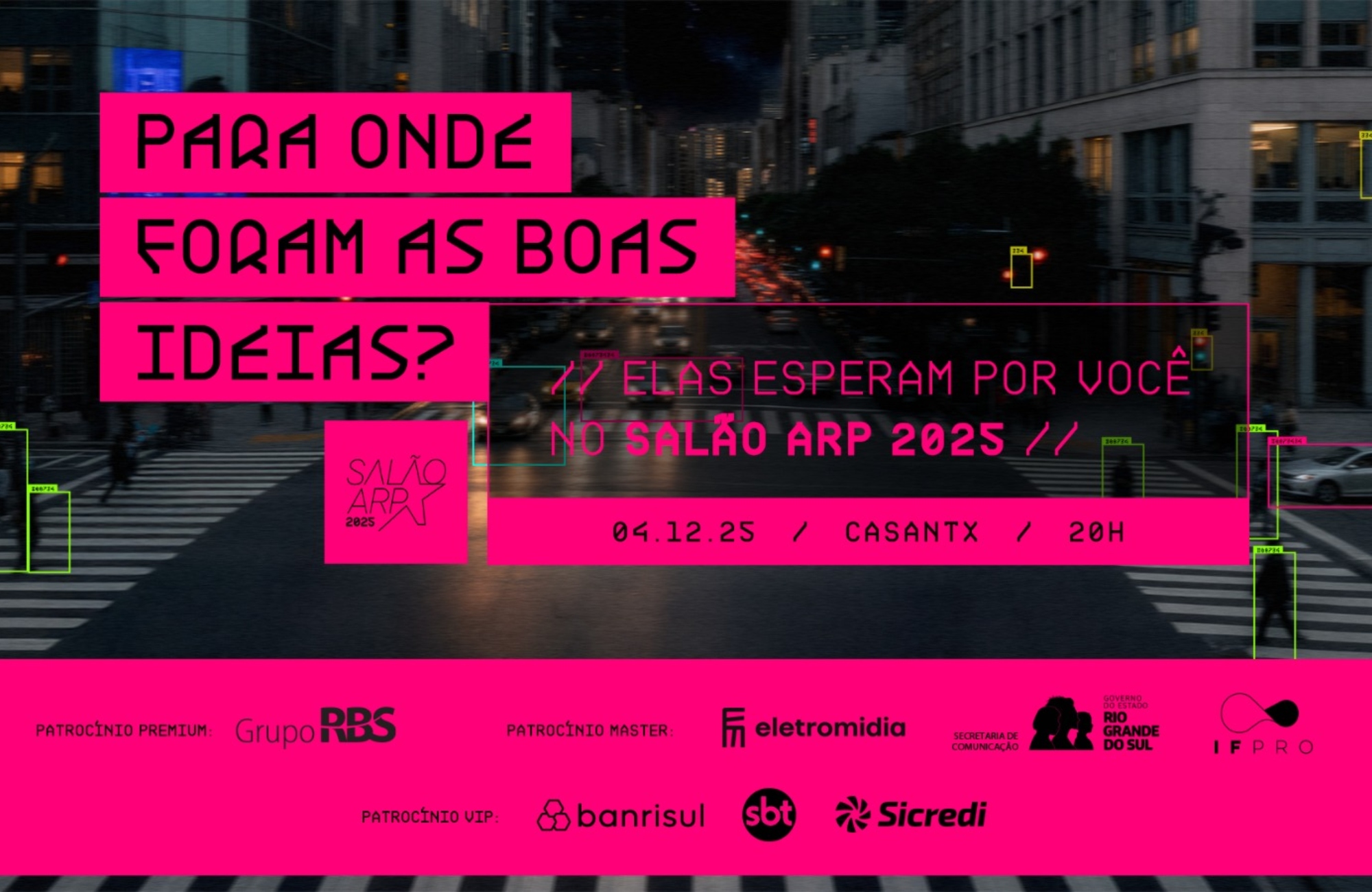 O Grupo RBS segue como Patrocinador Premium, mantendo uma parceria de longa data com o Salão ARP e sendo um dos principais pilares de apoio ao evento. Já na categoria Master, somam-se à Eletromídia, parceira já tradicional, a Secretaria de Comunicação do Estado (Secom) e a IFPRO, que participam pela primeira vez. Na categoria VIP, o evento mantém a parceria com o Banrisul e o SBT, enquanto Sicredi estreia entre os patrocinadores, marcando a união do Salão ARP ao sistema financeiro cooperativo. “A presença de todos os nossos patrocinadores, desde as parcerias consolidadas como o Grupo RBS, Banrisul e SBT, até a chegada estratégica da Secom, IFPRO e Sicredi, transformam o Salão ARP em um verdadeiro movimento do mercado. Este apoio é a garantia de que vamos celebrar e impulsionar a melhor produção criativa do Rio Grande do Sul,” afirma Fernando Silveira, presidente da ARP.