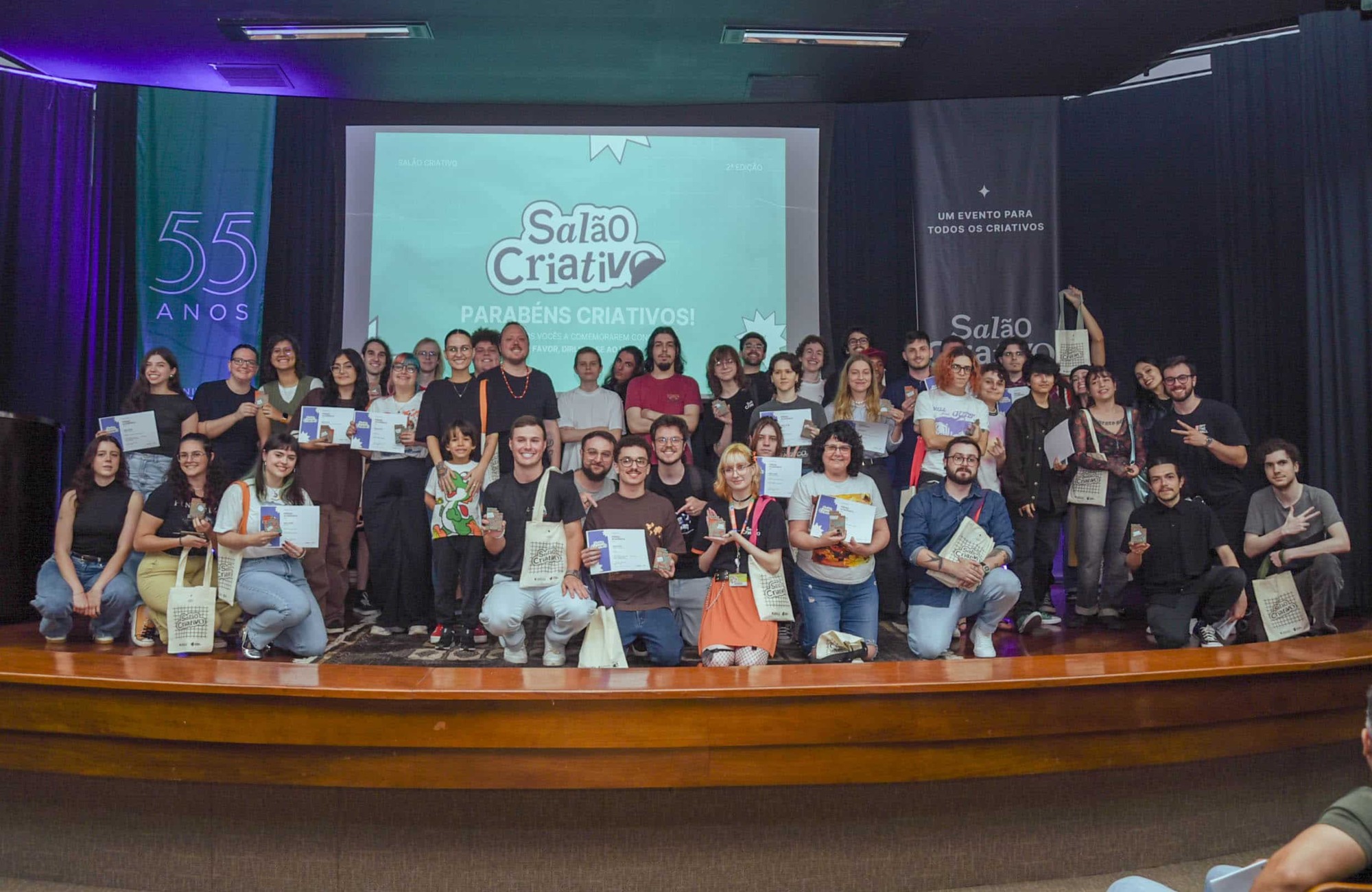 A Universidade Feevale realizou nesta quarta-feira (23) a cerimônia de premiação do Salão Criativo, evento que reconhece e valoriza trabalhos de estudantes da área de Indústria Criativa. O evento ocorreu no Salão de Atos do Câmpus II e contou com 10 categorias principais e 47 subcategorias, abrangendo diversas áreas do conhecimento. Ao todo, foram inscritos 223 projetos, realizados por 84 alunos autores e outros coautores.