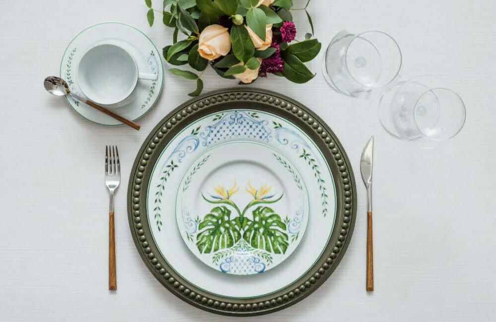 Já o charme de uma cerimônia ao ar livre invade o modelo Tropical que conta com as belas espécies Estrelícia (Strelitzia) e Costela de Adão. Leve e atual, a série dispõe de pratos, xícaras, bowls, canecas, bandejas quadradas e retangulares.