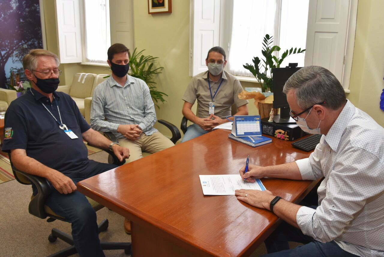 O prefeito em exercício de Santa Cruz do Sul, Elstor Desbessell, assinou nesta segunda-feira, 17 de janeiro, autorização para que a Associação Pró-Ensino em Santa Cruz do Sul (Apesc), dê início aos trabalhos de assessoria técnica para fins de planejamento e elaboração de projetos de macrodrenagem da microbacia do Arroio Jucuri, ao longo da Rua Coronel Jost, com destino final próximo à BR 471. O ato contou com a participação do secretário municipal de Obras e Infraestrutura, Edmar Hermany, do engenheiro civil da Secretaria Municipal de Planejamento e Orçamento (Sepor), Daniel Feuerharmel, e do engenheiro ambiental da Unisc, Marcelo Luis Kronbauer.