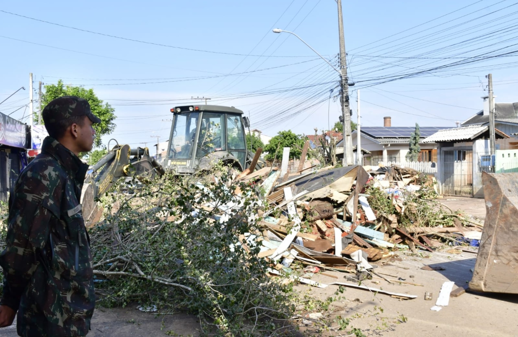 A Rua Leopoldo Wasun e a Avenida Montevidéo, no bairro Santo Afonso, são os focos da limpeza e do recolhimento de bens inutilizados pelos atingidos durante a enchente nesta quarta-feira, dia 5. Retroescavadeiras, caminhões, servidores e militares trabalham nas duas vias, e até o final do dia será atingida a marca de 16,8 mil toneladas de resíduos retirados das ruas desde os primeiros dias em que as águas começaram a baixar, permitindo que as equipes acessassem os locais de forma segura.