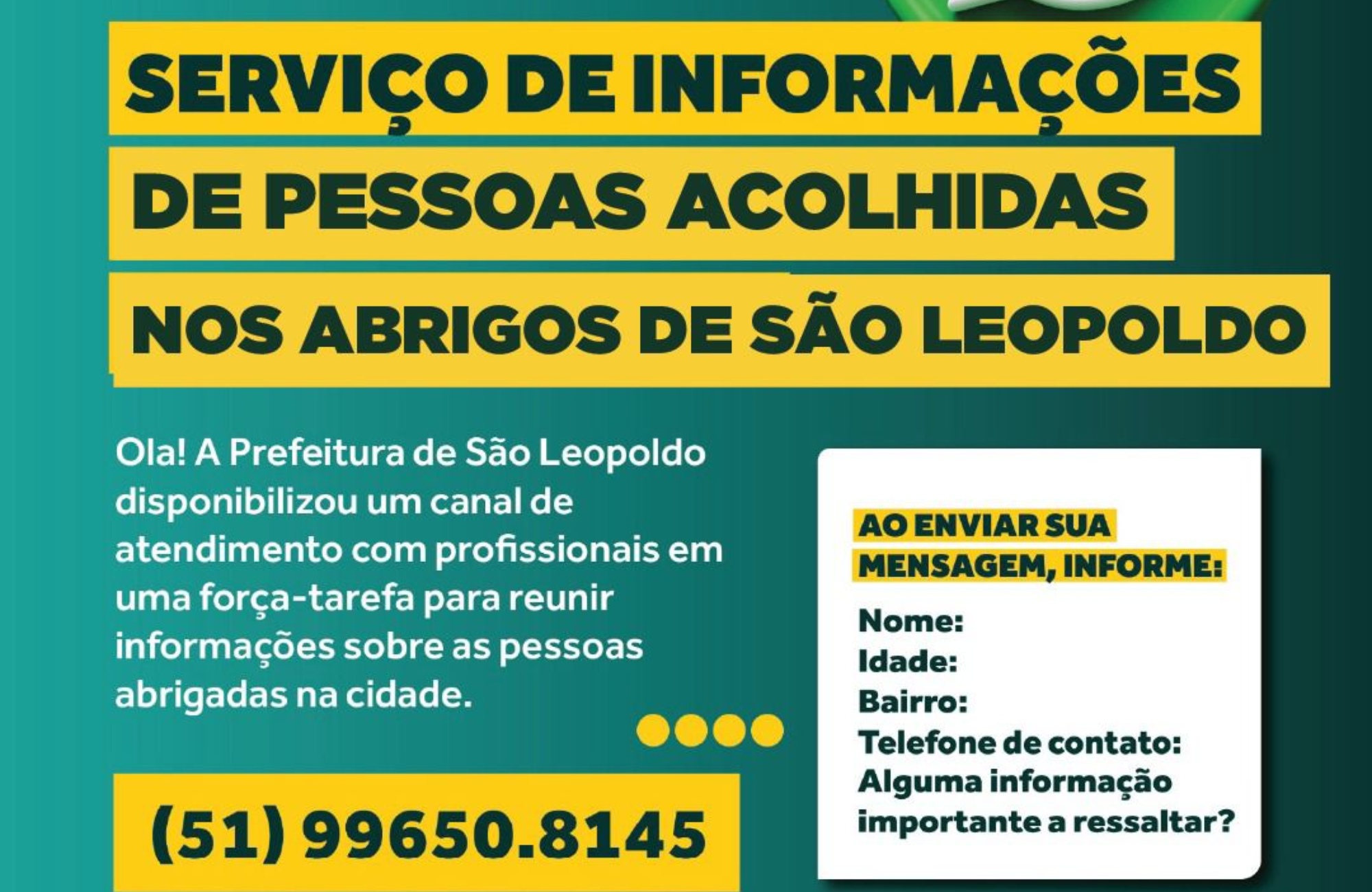 A Prefeitura de São Leopoldo informa que foi possível estabelecer a partir desta quarta-feira, 8 de maio, um canal de atendimento para atender familiares e amigos que buscam informações sobre pessoas que estejam acolhidas nos 62 abrigos informados até o momento.