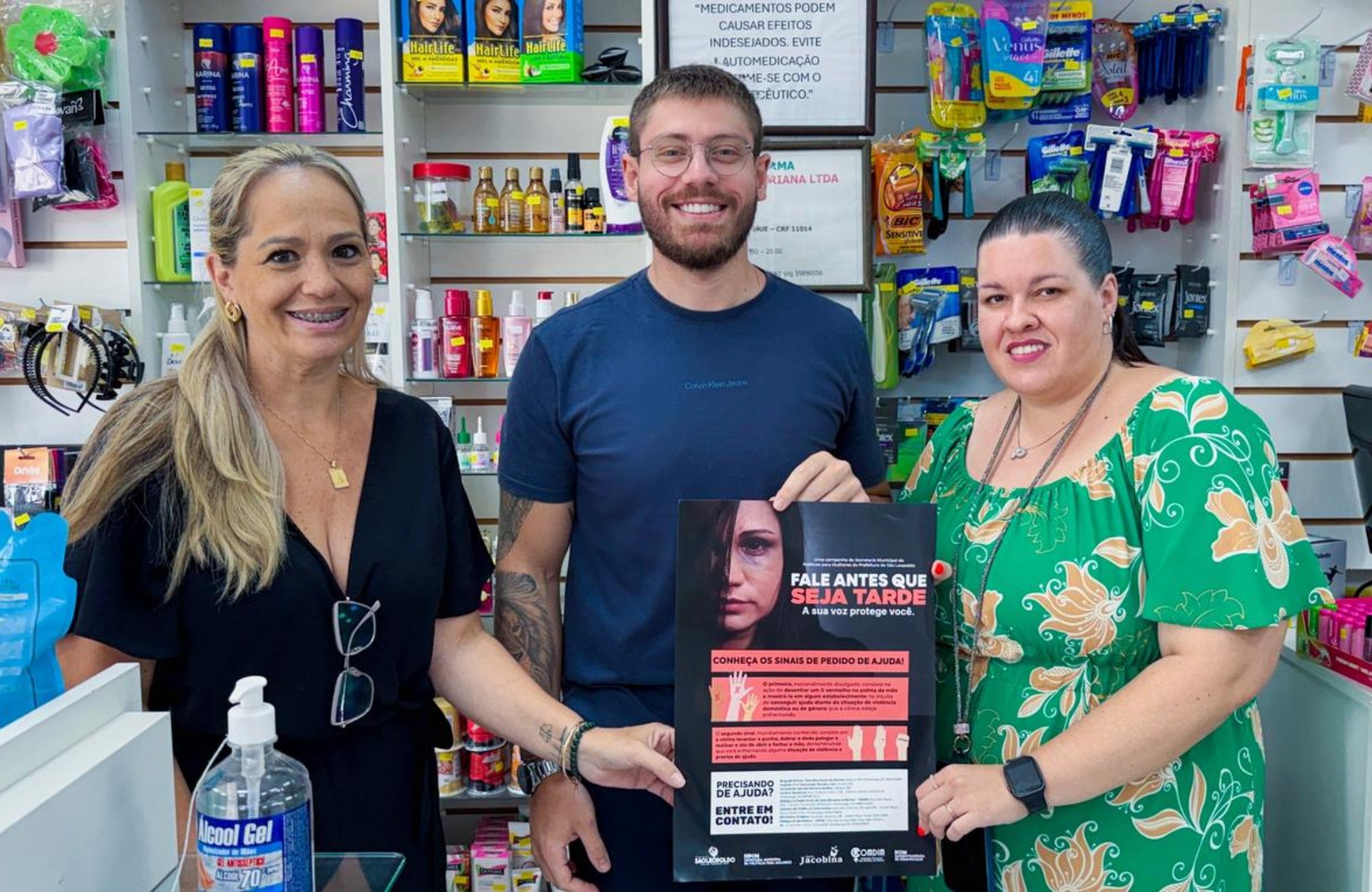 A atividade percorreu diferentes estabelecimentos comerciais da cidade, incluindo unidades das farmácias São João, Tribarato, Agafarma e Unifarma. Durante as visitas, foram disponibilizados informativos com dados sobre a rede de proteção e instruções sobre como buscar ajuda em casos de violência doméstica.
