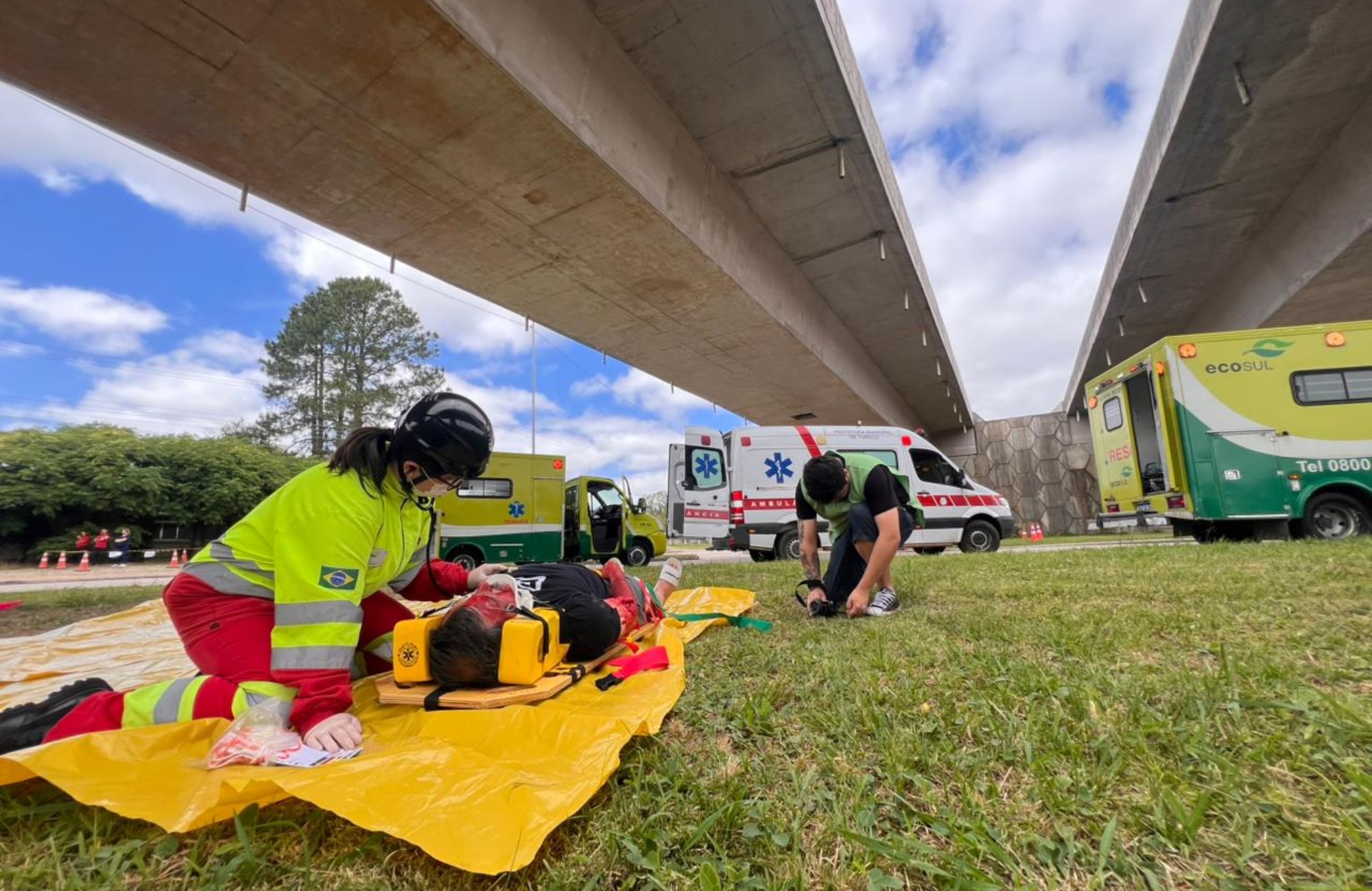 A Ecovias Sul realizou, na manhã deste sábado, um simulado de acidente com múltiplas vítimas no km 483 da BR-116, em Turuçu. O exercício, que reuniu equipes da concessionária, do SAMU de Pelotas e da prefeitura de Turuçu, teve como objetivo avaliar o tempo de resposta e o nível de integração entre os órgãos envolvidos no atendimento a ocorrências de grande complexidade. O tempo de chegada da primeira ambulância da concessionária ao local foi de 6 minutos, assim como a da Prefeitura de Turuçu. Já o veículo do SAMU levou 29 minutos para chegar no sinistro.