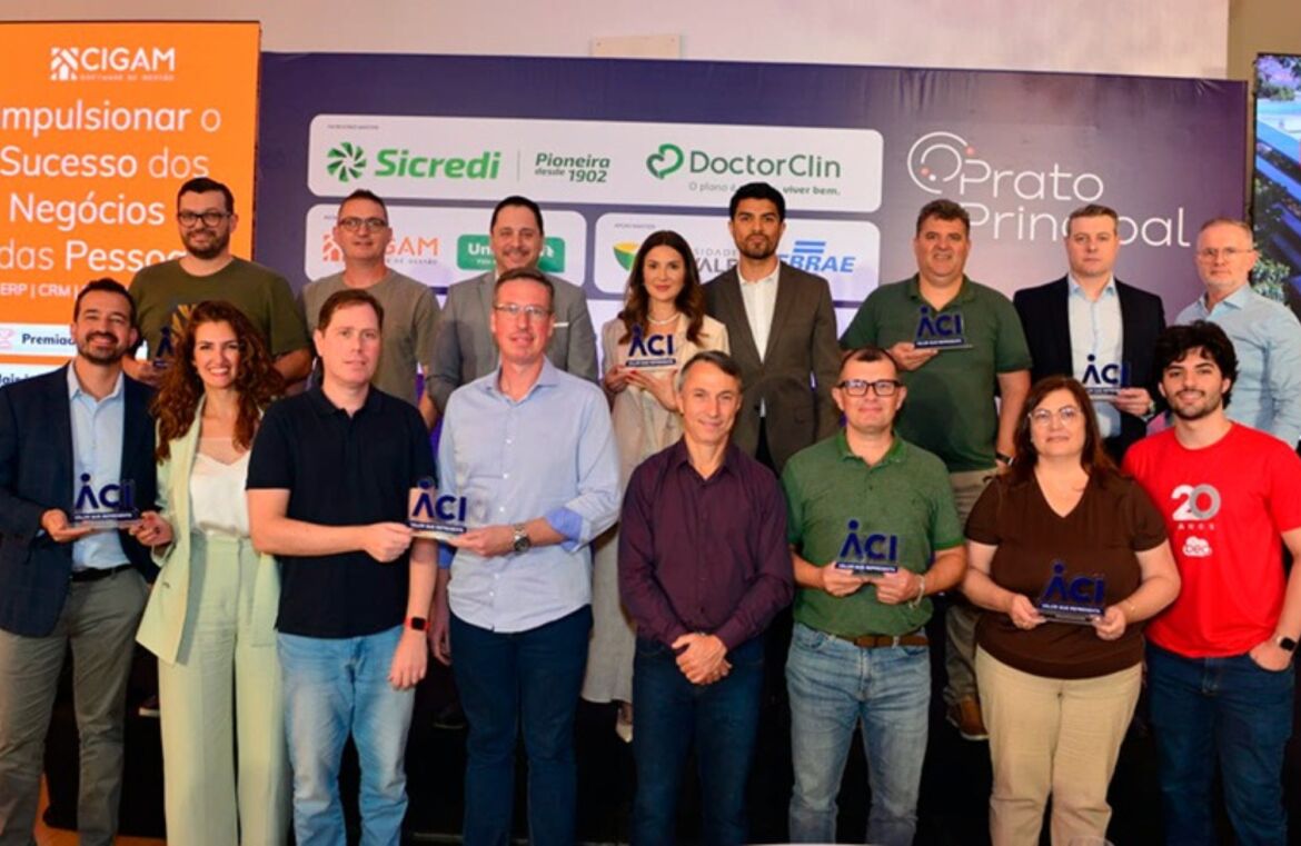 Além de receberem as homenagens no palco, os representantes das empresas participaram, ao final da solendiade, de uma foto coletiva com o presidente em exercício da ACI, Jair Ross, que conduziu o ato.