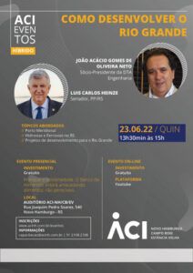 Estarão presentes ao auditório da entidade (Rua Joaquim Pedro Soares, 540) João Acácio Gomes de Oliveira Neto, sócio-presidente da DTA Engenharia, e Luis Carlos Heinze, senador pelo PP/RS, que analisarão projetos como o Porto Meridional, a ser construído em Arroio do Sal, hidrovias e ferrovias e outros relacionados ao desenvolvimento gaúcho.