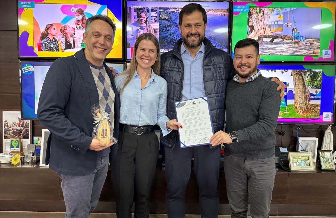 A Prefeitura de Estância Velha assinou o termo de adesão à Rede Brasileira Cidade das Crianças na manhã desta segunda-feira (1º), na Prefeitura de Jundiaí, cidade do interior de São Paulo. O prefeito estanciense Diego Francisco (PSDB) compareceu a cerimônia junto da coordenadora pedagógica da Secretaria de Educação e Cultura (Semec), Jaqueline Hansen. A partir da adesão, a cidade do Vale dos Sinos passa a integrar uma rede de 17 cidades que levam um selo especial, que celebra o compromisso da administração em prol de políticas públicas que aproximem as crianças da cidade e valorizem o olhar à primeira infância.