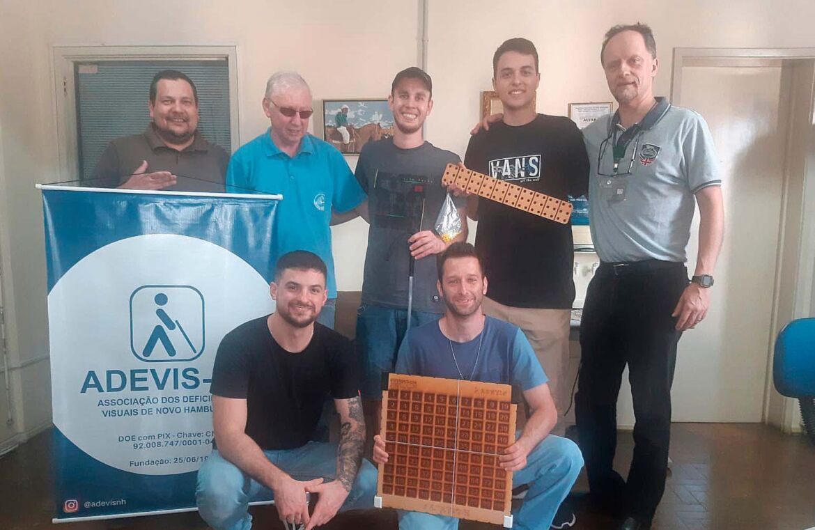 A Associação dos Deficientes Visuais de Novo Hamburgo (Adevis-NH) recebeu nesta terça-feira (6), a doação de novos materiais. Eles foram doados por 12 estudantes da disciplina Projeto de Fábrica, vinculada aos cursos de Gestão da Produção Industrial, Engenharia de Produção e Engenharia Mecânica da Universidade Feevale. Ao todo, foram entregues 12 bengalas, 12 alfabetos pedagógicos e 12 peças de calculadora para deficientes.
