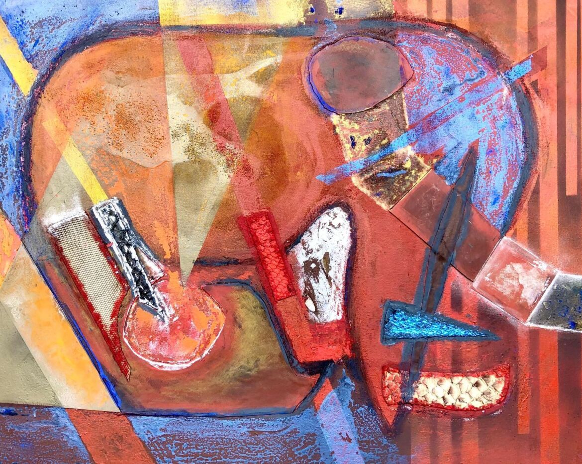 Das conhecidas telas abstratas em cores vibrantes, sobretudo o vermelho e o dourado, às decupagens e stencils com grafite, desde 2019 vem surpreendendo em seus feitos pictóricos, a partir de experimentações com materiais que vão de pigmentos puros, papéis variados, pedras preciosas, metais, ao uso de couros.