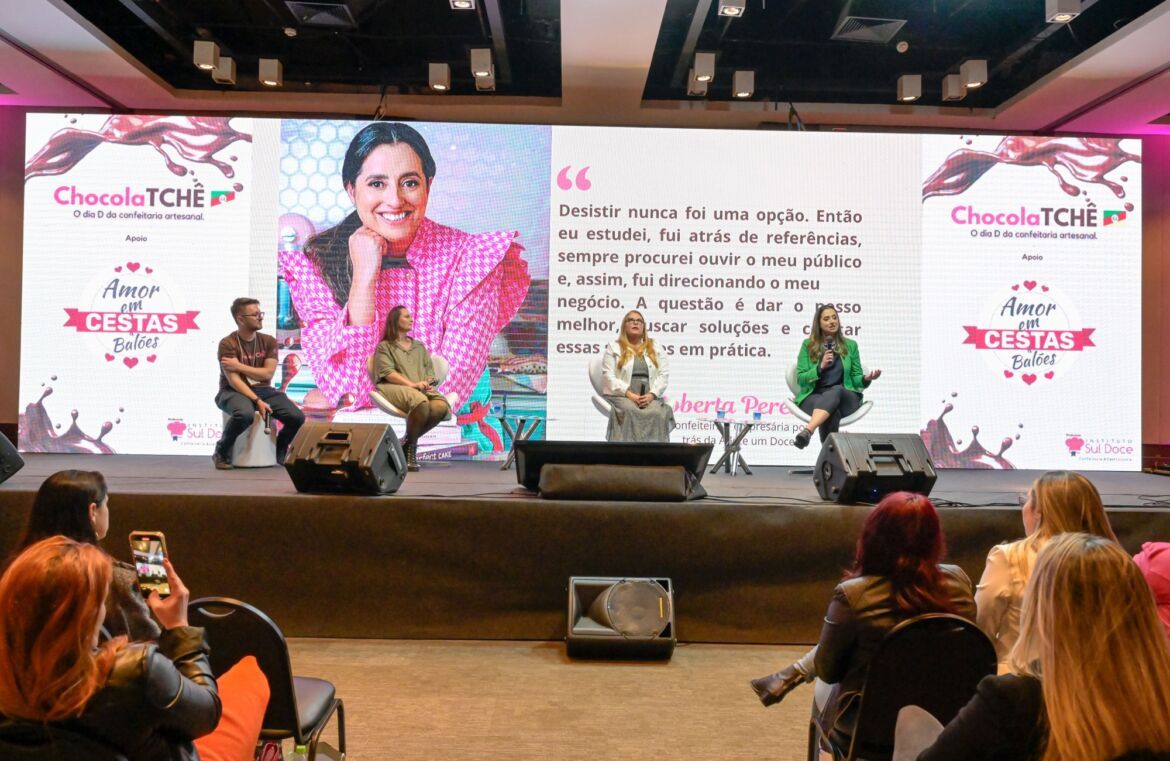 “Diante dos obstáculos, você desiste ou persiste?”. Este foi o tema do painel que deu continuidade ao ciclo de palestras da segunda edição da ChocolaTCHÊ, na tarde desta terça-feira, 10 de setembro, no Centro de Eventos do Parkshopping Canoas. Participaram como painelistas o fundador da Alfajores Odara, Jeison Scheid, a proprietária da LeFran Doceria, Franciele Ramires e o consultor e empresário João Rodrigues. A mediadora foi a jornalista Bruna Magalhães.