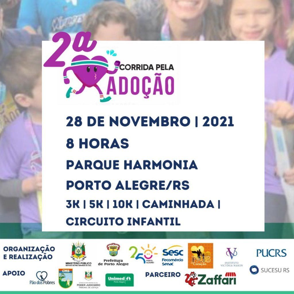 A 5ª edição da Corrida pela Adoção será realizada neste sábado, 17 de maio, no Parque Esportivo da PUCRS, em Porto Alegre. O evento marca a abertura da Semana da Adoção na capital gaúcha e tem como objetivo conscientizar a população sobre a situação de crianças e adolescentes acolhidos, promovendo temas como adoção tardia, apadrinhamento afetivo e famílias acolhedoras.