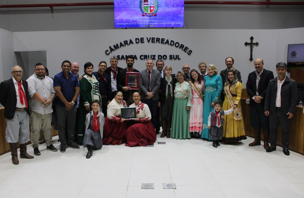 A Câmara de Vereadores de Santa Cruz do Sul realizou sessão solene para homenagear o Centro de Tradições Gaúchas pelos 66 anos de fundação e sua Invernada Juvenil, pela conquista do 5º lugar no Juvenarte. A proposição foi do vereador Licério Agnes (PSD). A reunião foi conduzida pelo presidente Rodrigo Rabuske (PTB) e contou com a presença do vice-prefeito Elstor Desbessel; do secretário do Legislativo, Raul Fritsch; do patrão do CTG Tropeiros da Amizade, Juliano Brum Ottes; do ex-patrão do Tropeiros, Antonio Pereira dos Santos; da presidente da Associação Tradicionalista Santa-cruzense, Rosângela Jochims; da coordenadora da 5ª Região Tradicionalista, Marisa Rosa; do coordenador do Acampamento do Enart, Claudio Mariane; o segundo piá do Estado, Gabriel Kothe Bartz; e a prenda mirim, Anita Neitzke de Oliveira.