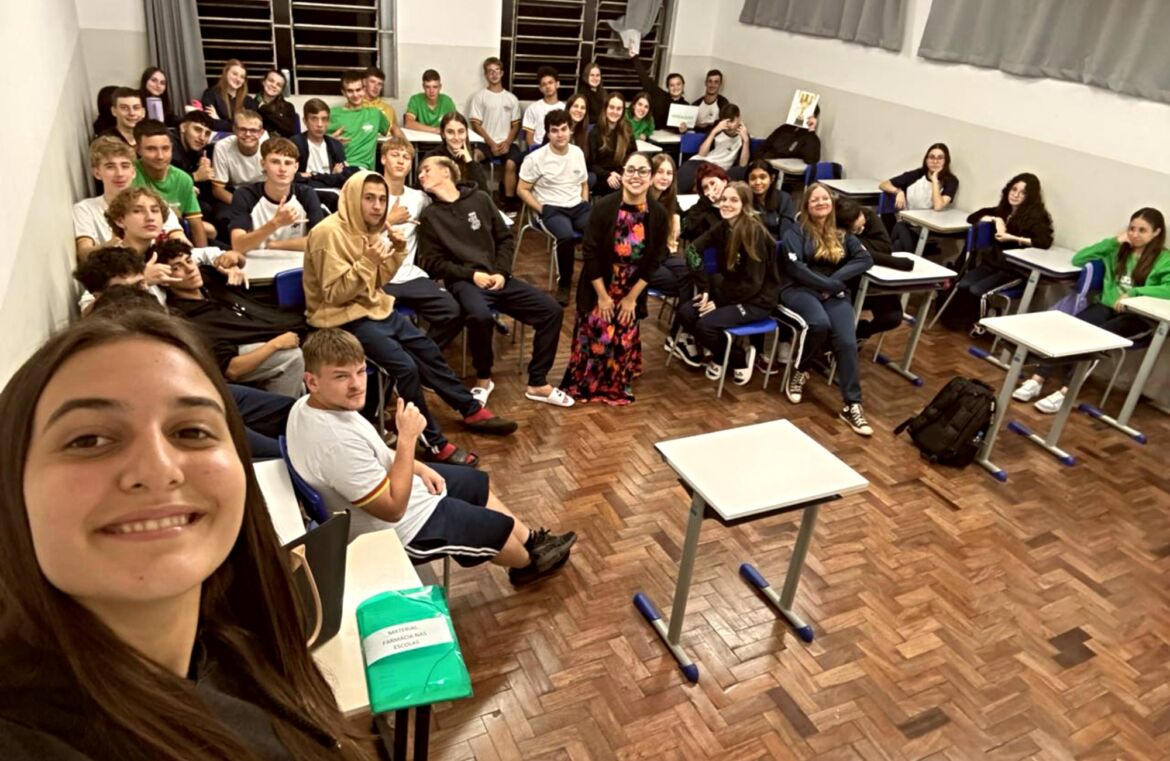 A farmacêutica da Farmácia Municipal de São José do Hortêncio, Taciéli da Rosa, esteve no Instituto Estadual Alfredo Oscar Kiefer na quinta-feira (9) para desenvolver atividades do programa Farmácia Vai à Escola. A ação envolveu estudantes do 1º, 2º e 3º anos do ensino médio e contou com a aplicação de um jogo didático interativo.