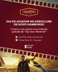 O Aeroclube de Novo Hamburgo será palco para uma exibição gratuita do filme “Top Gun: Maverick” neste domingo, 27 de outubro, em celebração ao Dia do Aviador, com o apoio da Secretaria da Cultura. O evento começará às 8h e terá uma programação variada, culminando com a sessão de cinema a céu aberto.