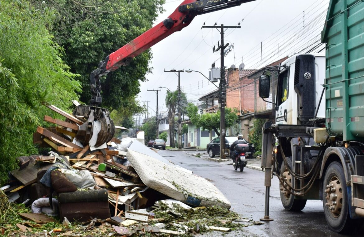Nesta segunda-feira, dia 13, equipes de limpeza, sob coordenação da Secretaria Municipal de Meio Ambiente, estão atuando nas ruas dos bairros Canudos, Santo Afonso, Industrial e Lomba Grande, recolhendo os materiais descartados pela população que ficaram danificados pelas águas. Esse trabalho de limpeza nos bairros afetados continuará nas próximas semanas.