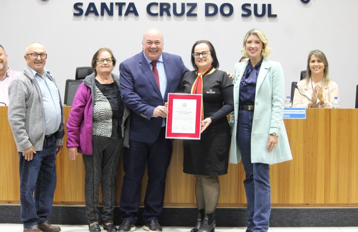 A Escola de Língua Alemã Auf gut Deutsch foi homenageada em sessão solene da Câmara de Vereadores de Santa Cruz do Sul na noite desta segunda-feira (22). A cerimônia foi realizada em reconhecimento aos 20 anos de atuação na área educacional e cultural no município do Vale do Rio Pardo. A proposição da homenagem foi feita pelo vereador Jair Eich (PP).