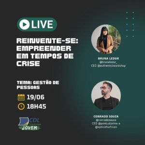 A série de lives “Reinvente-se: empreender em tempos de crise” será continuada pelo CDL Jovem nesta quarta-feira, 19 de junho, às 19h. O grupo da Câmara de Dirigentes Lojistas (CDL) de Sapiranga promove os encontros online com o objetivo de oferecer orientações estratégicas para a retomada dos negócios em meio à calamidade pública. A nova edição contará com a presença da coordenadora Bruna Ledur e do especialista convidado Conrado Souza, que abordarão o tema da gestão de pessoas.