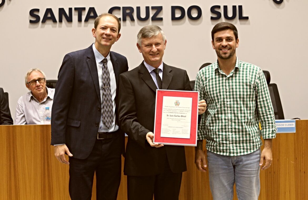 A sessão solene também concedeu o título de Cidadão Santa-cruzense a Luís Carlos Dhiel. Nascido em 7 de julho de 1966 em Linha Santa Emília, Venâncio Aires, Dhiel é uma figura no cenário da comunicação regional. Sua trajetória profissional começou no Riovale Jornal, passando pela assessoria de imprensa da Oktoberfest. Em 1992, adquiriu parte da empresa do jornalista e atual diretor da Expansão, Sérgio Jost, que em 1997 se tornaria o Jornal Arauto.