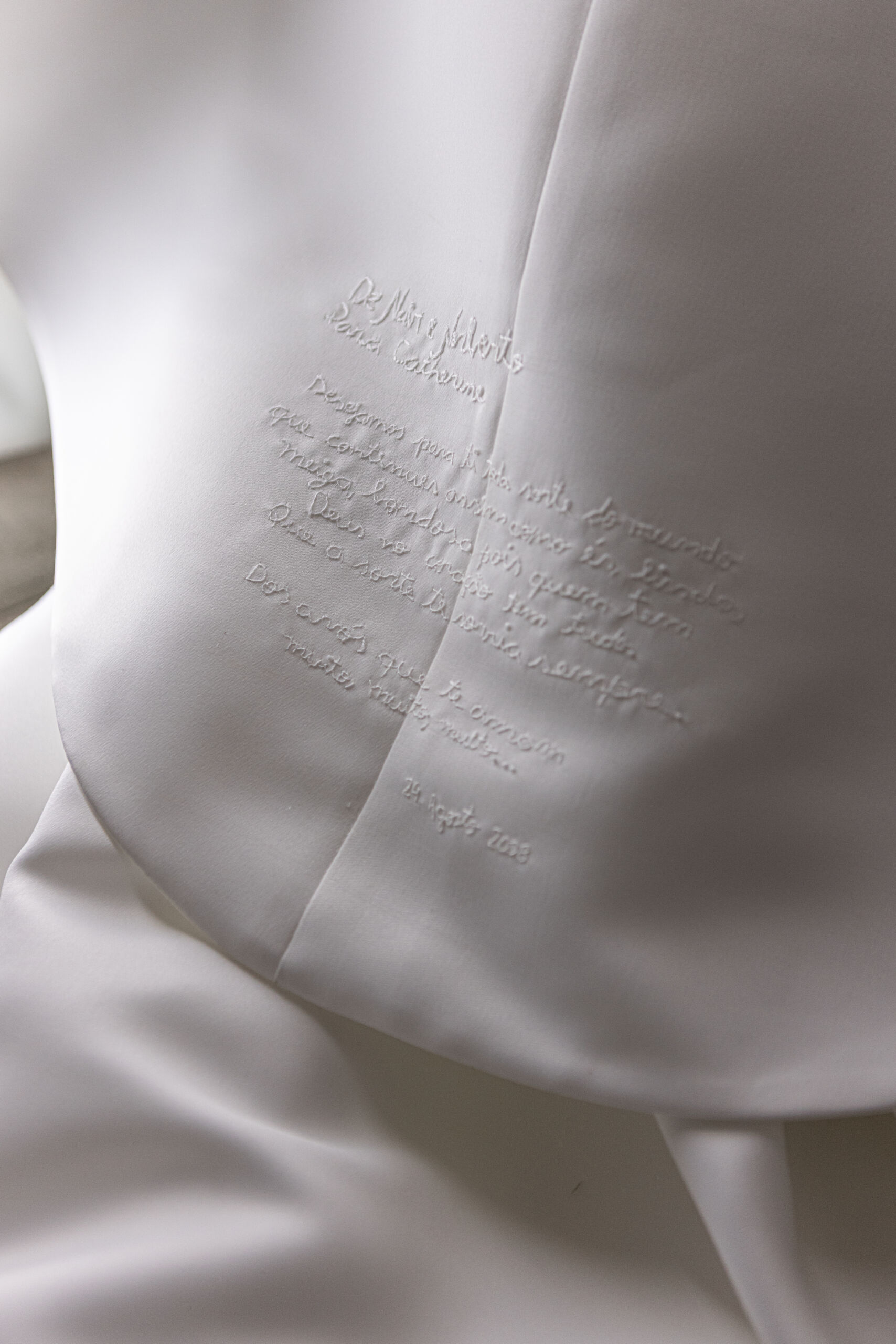 A noiva explicou a motivação para incluir a carta da avó, escrita em 2008. “Ela adorava moda e vestidos. Quando contei que estava noiva, a primeira coisa que me perguntou foi como seria meu vestido. Quis homenageá-la dessa forma”, afirma Catherine. O processo de criação durou cerca de seis meses, com provas realizadas em Garibaldi, a 1h30min de carro de Porto Alegre, acompanhada pela mãe e pela irmã.