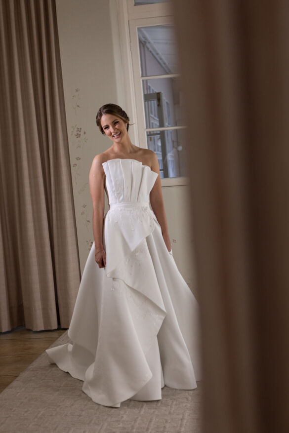 Catherine Rothbarth decidiu encomendar o vestido com a estilista após ver o trabalho dela no vestido de uma amiga. “Era um modelo todo plissado, achei lindo. Ali decidi que queria fazer meu vestido com a Camila”, conta a noiva. Na primeira reunião, ela solicitou um modelo assimétrico e minimalista com personalidade. A estilista enviou três croquis, e Catherine escolheu um sem alterações posteriores.