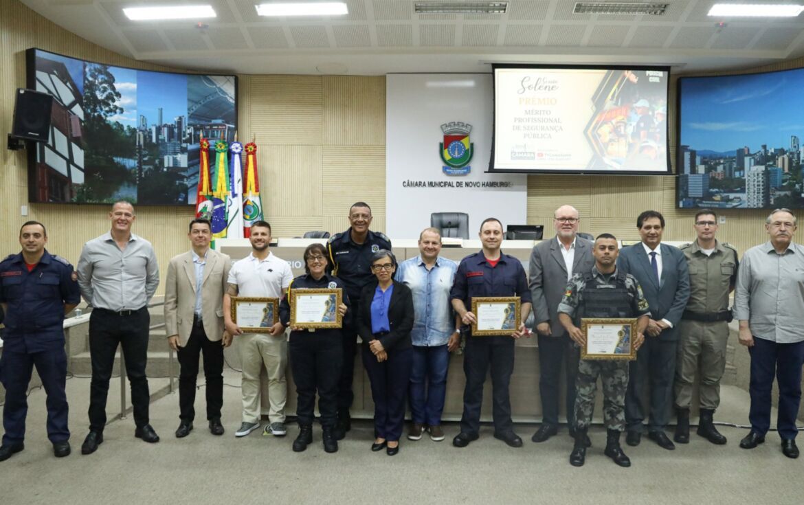 Em sessão solene realizada na noite desta quinta-feira, 17, a Câmara entregou o Prêmio Mérito Profissional de Segurança Pública. Por indicação da Brigada Militar, Corpo de Bombeiros, Guarda Municipal e Polícia Civil, quatro profissionais das corporações receberam reconhecimento por seu desempenho no cuidado com a população de Novo Hamburgo. Criado pela Câmara em 2011, a honraria distingue os escolhidos por suas atuações e atos de bravura ao longo do ano. Depois das edições de 2012 e 2014, o prêmio voltou a ser concedido este ano por iniciativa da Mesa Diretora da Casa – Cristiano Coller (PTB), presidente; Fernando Lourenço (Avante), vice; Ricardo Ritter – Ica (PSDB), primeiro-secretário; e Vladi Lourenço (PSDB), segundo-secretário.