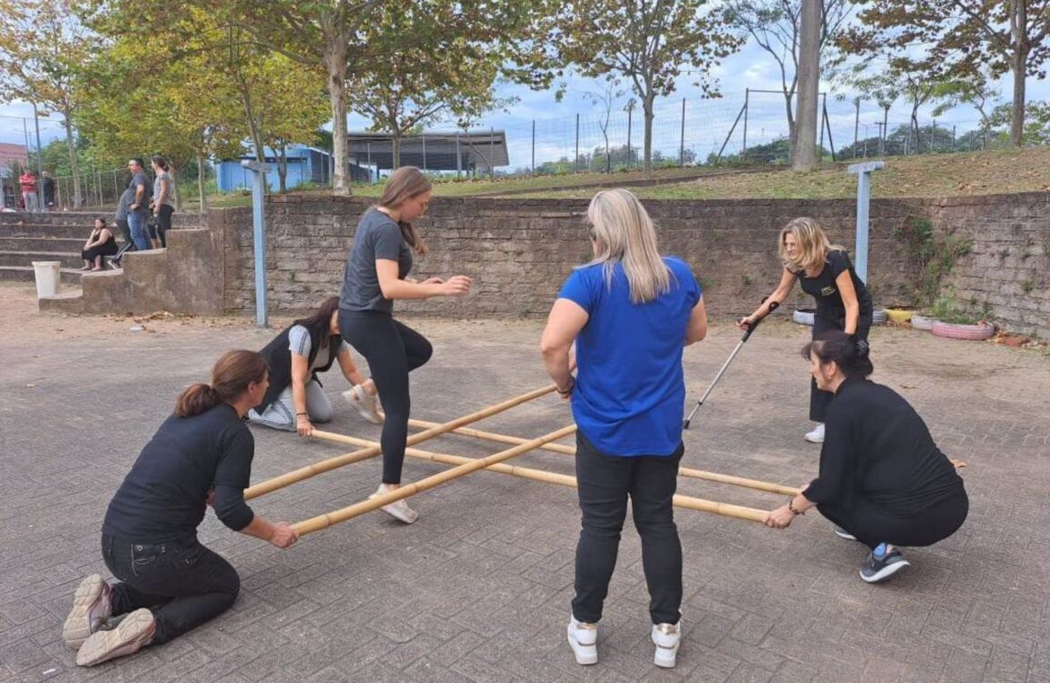 A professora de Educação Física da Smec, Iara Maldaner Moller, especialista em psicomotricidade, provocou reflexões sobre as memórias de infância e adolescência relacionadas ao movimento e os sentimentos implicados nessas lembranças. Todos os professores puderam vivenciar um circuito de práticas corporais ao ar livre, com materiais simples, mas muito potentes para promover o movimento. As atividades renderam momentos de muita diversão e instrumentalizaram os profissionais para suas práticas nas escolas com as crianças desde a Educação Infantil até o Ensino Fundamental.