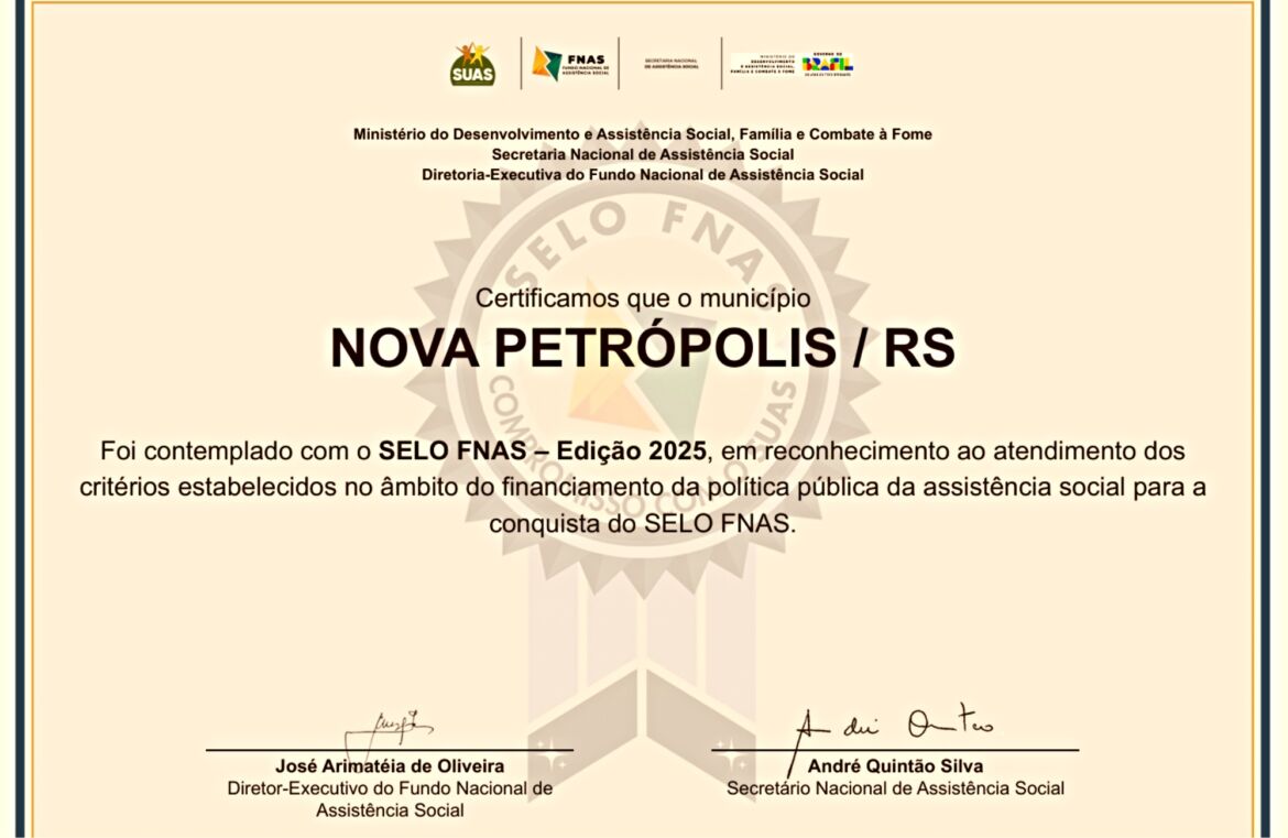 Nova Petrópolis recebeu o Selo FNAS 2025, concedido pelo Fundo Nacional de Assistência Social, como reconhecimento à gestão dos recursos públicos e à qualificação dos serviços na área social. A distinção foi atribuída à Secretaria de Saúde e Assistência Social e destaca o cumprimento de critérios técnicos relacionados à execução financeira, planejamento e prestação de contas no âmbito do Sistema Único de Assistência Social (Suas). O selo reconhece práticas de gestão que buscam garantir a aplicação eficiente dos recursos e a ampliação da proteção social à população.