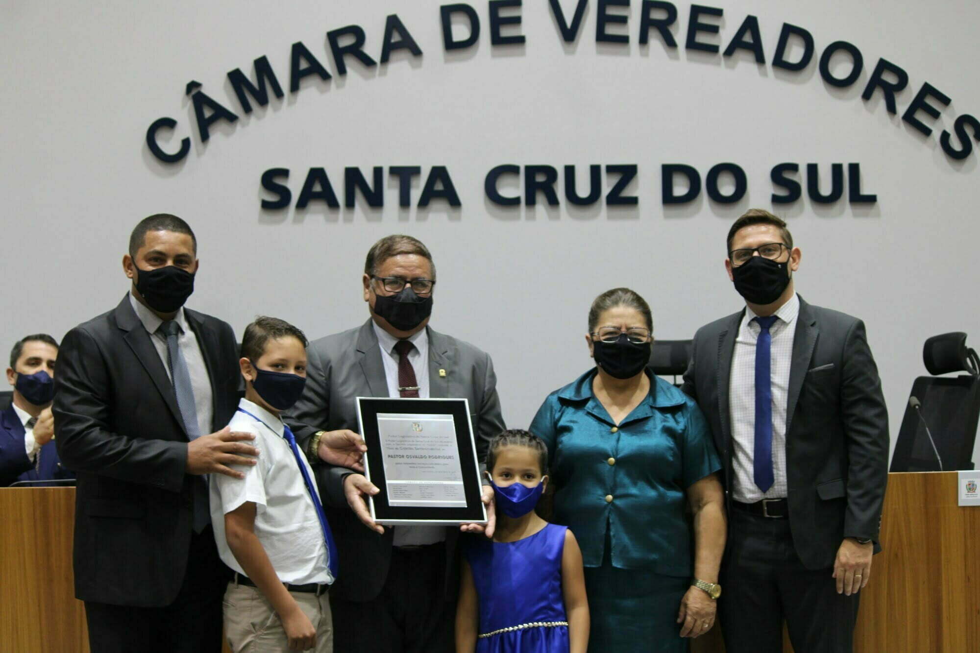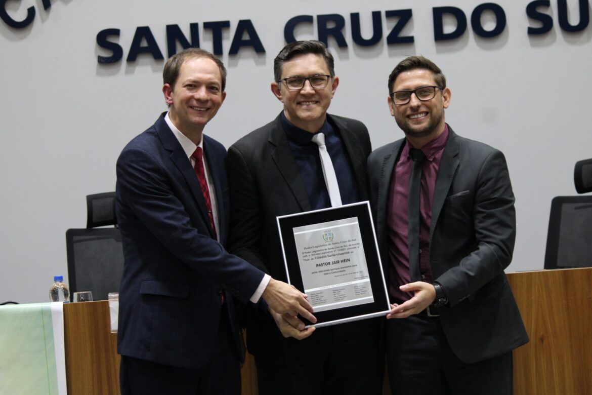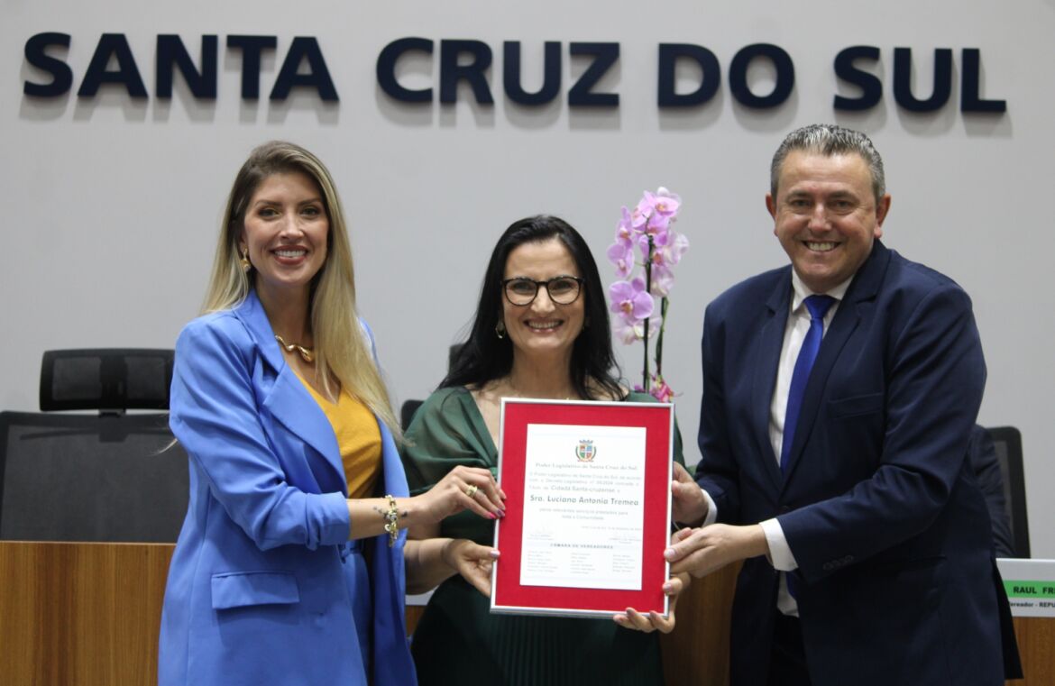 A Câmara de Vereadores de Santa Cruz do Sul entregou o título de Cidadã Santa-cruzense à professora Luciana Antonia Tremea em sessão solene na realizada nesta segunda-feira (16). A homenagem foi proposta pela vereadora Nicole Weber (Podemos). A cerimônia foi conduzida pelo presidente do legislativo santa-cruzense, Gerson Luís Trevisan (PSDB), e contou com a presença do primeiro secretário da Câmara, Raul Gilnei Fritsch (Republicanos), além do esposo da homenageada, Jaime Laufer, e do filho, João Vitor Tremea Laufer.