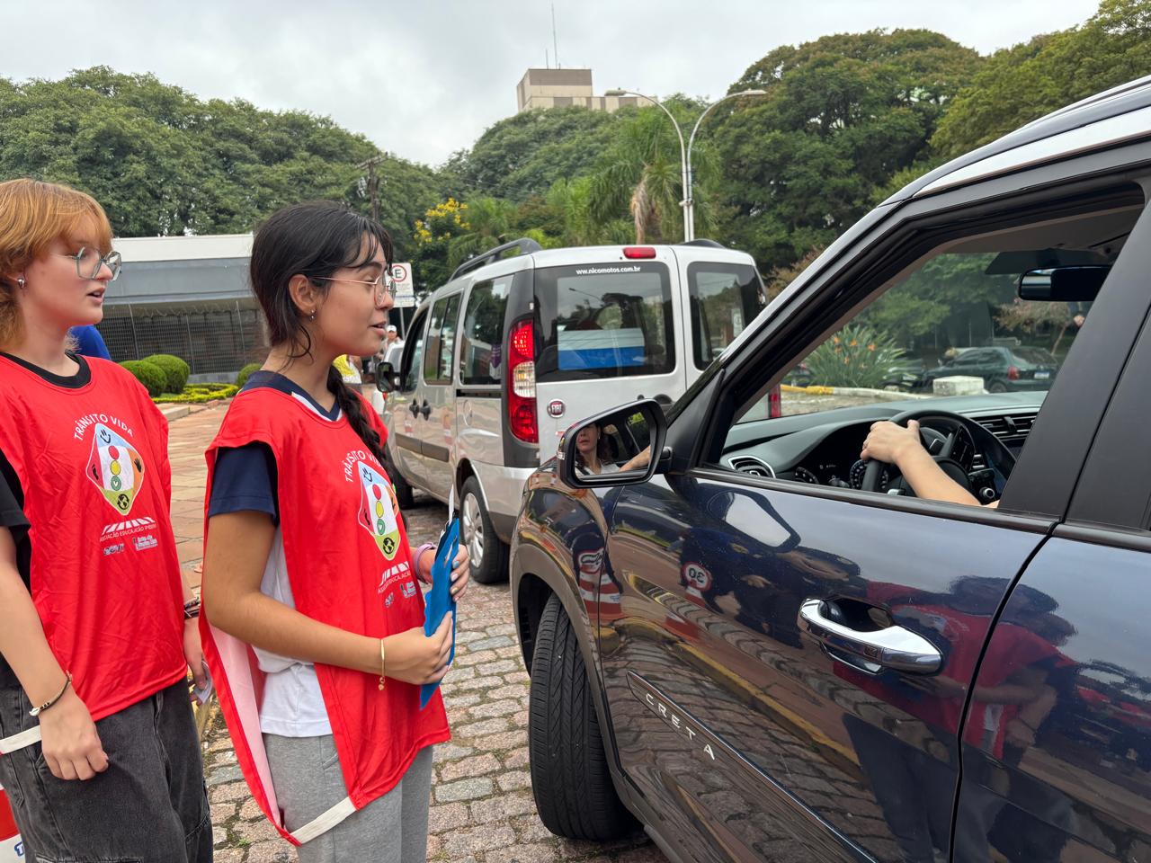 As atividades começaram com uma roda de conversa com alunos do 3º ano do ensino fundamental do Colégio Dom Alberto. Em seguida, os estudantes participaram da abordagem a motoristas que circulavam pelo local, repassando orientações sobre o uso da faixa de segurança, respeito aos pedestres, obrigatoriedade do cinto de segurança e a proibição do uso de celular ao volante, conforme previsto no Código de Trânsito Brasileiro.