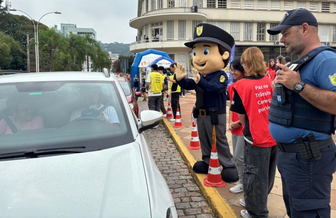 Uma blitz educativa mobilizou estudantes e motoristas na manhã desta terça-feira (17), na Rua Ramiro Barcelos, em frente à Catedral São João Batista, em Santa Cruz do Sul. A ação foi promovida pela Prefeitura, por meio da Guarda Municipal, em parceria com entidades e instituições de ensino, com o objetivo de conscientizar a população sobre segurança no trânsito por meio de abordagens diretas e atividades educativas.