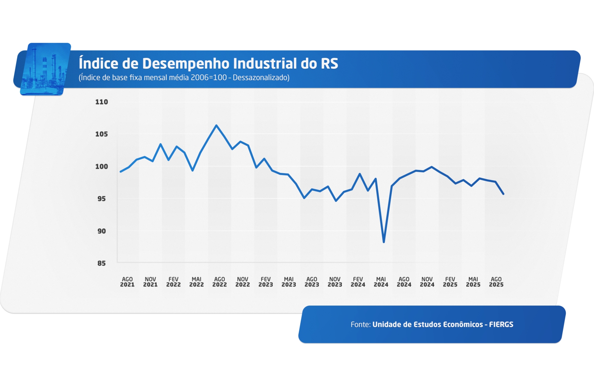 O Índice de Desempenho Industrial do Rio Grande do Sul (IDI-RS) registrou queda de 1,9%, em agosto, na comparação com julho, segundo levantamento divulgado na quarta-feira (8) pelo Sistema Fiergs. O recuo ocorre no primeiro mês de vigência das tarifas de 50% impostas pelos Estados Unidos sobre produtos brasileiros e representa a maior retração desde maio de 2024, quando o estado enfrentou a pior enchente de sua história.
