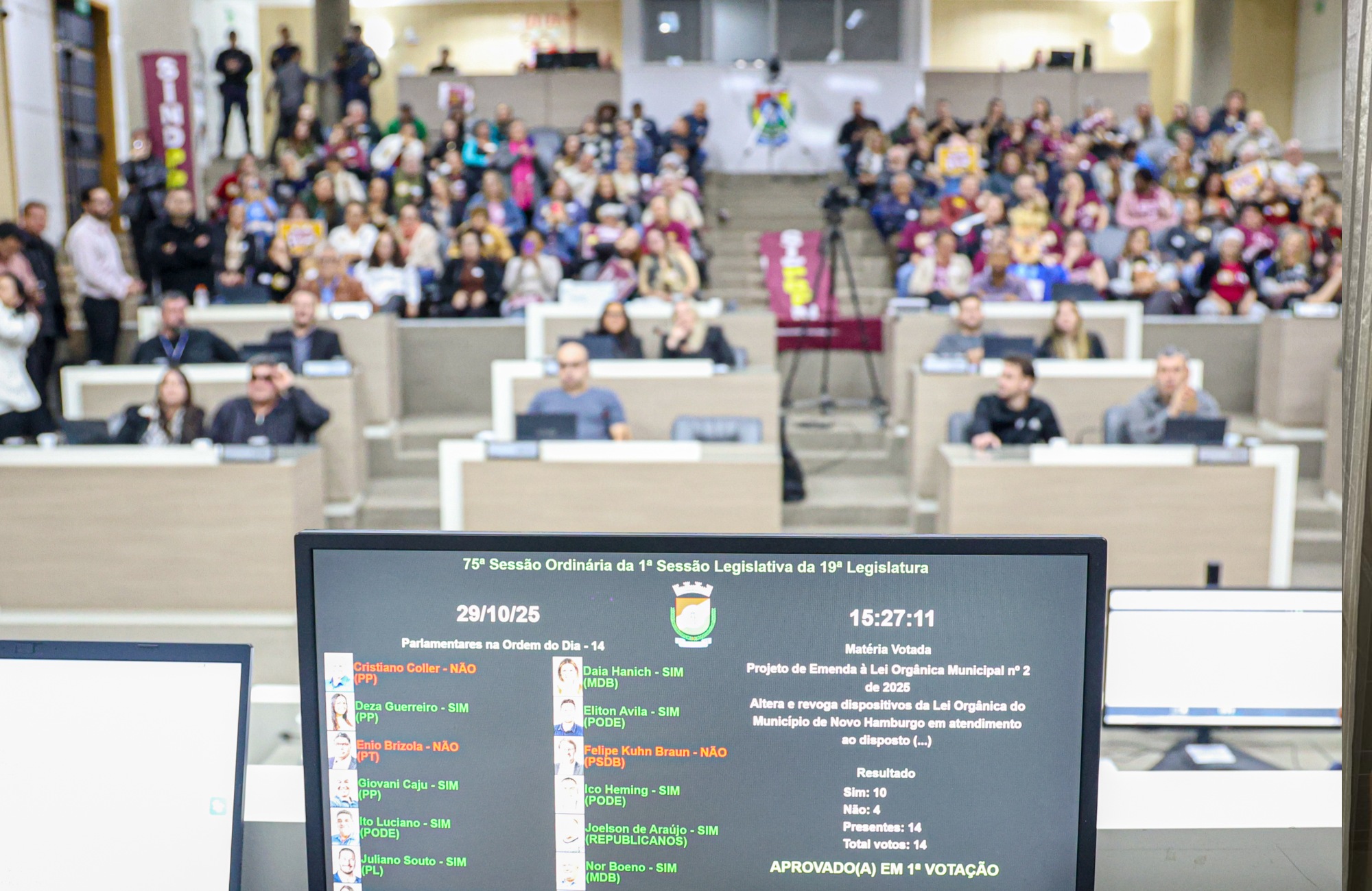 A Câmara de Novo Hamburgo aprovou por 10 votos a 4, em primeiro turno, nesta segunda-feira, 29, o Projeto de Emenda à Lei Orgânica nº 2/2025, que trata da Reforma da Previdência Municipal. A proposta do Executivo chega ao plenário após um longo período de discussões, tramitação nas comissões permanentes e uma audiência pública marcada por divergências entre representantes do governo e servidores. O texto busca adequar o regime previdenciário local às normas nacionais, definindo novas idades mínimas para aposentadoria e instituindo o modelo contributivo e solidário.